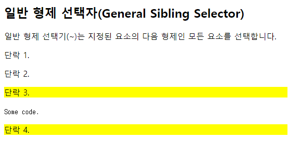 | <!DOCTYPE html> <html> <head> <style> div ~ p { background-color: yellow; } </style> </head> <body> <h2>일반 형제 선택자(General Sibling Selector)</h2> <p>일반 형제 선택기(~)는 지정된 요소의 다음 형제인 모든 요소를 선택합니다.</p> <p>단락 1.</p> <div> <p>단락 2.</p> </div> <p>단락 3.</p> <code>Some code.</code> <p>단락 4.</p> </body> </html> |