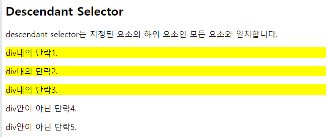 | <!DOCTYPE html> <html> <head> <style> div p { background-color: yellow; } </style> </head> <body> <h2>Descendant Selector</h2> <p>descendant selector는 지정된 요소의 하위 요소인 모든 요소와 일치합니다.</p> <div> <p>div내의 단락1.</p> <p>div내의 단락2.</p> <section><p>div내의 단락3.</p></section> </div> <p>div안이 아닌 단락4.</p> <p>div안이 아닌 단락5.</p> </body> </html> |