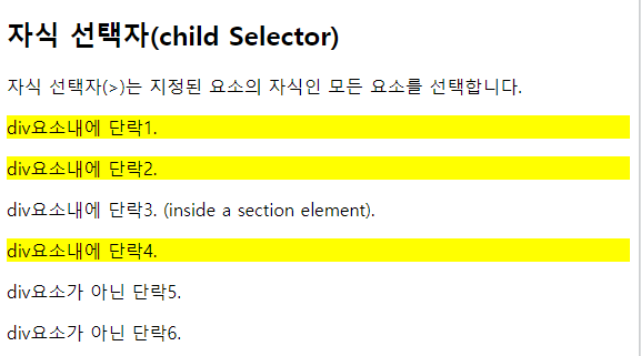 div > p로 div의 자식 선택자는 div요소에 배경색을 노랑색으로 설정한다. 단락1, 단락2, 단락 4는 div에 자식 선택자로 배경색이 노랑색이지만 '단락3'은 descendant이지만 child는 아니기에 배경색이 노랑색으로 설정되지 않는다. 위의 코드를 실행한 결과 화면은 아래 그림과 같다.