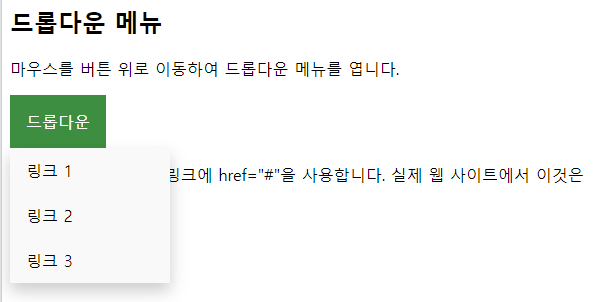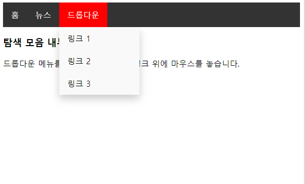 드롭다운 메뉴에 마우스를 올려놓으면 아래 그림과 같이 링크1, 링크2, 링크3 메뉴가 표시된다.