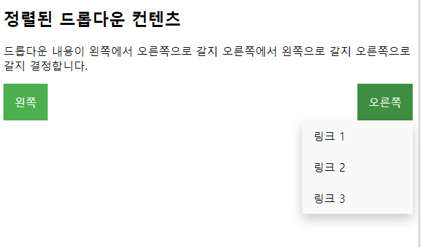 오른쪽으로 드롭다운메뉴를 위치시키려면 right:0으로 설정하여 지정한다. 실행한 그림은 아래 그림과 같다.