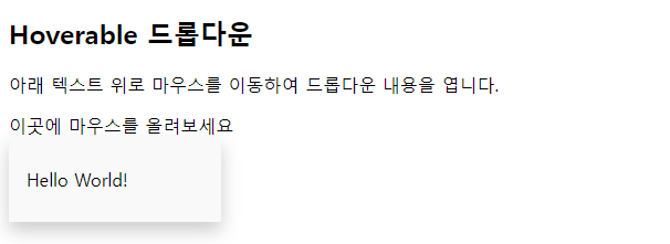 | <!DOCTYPE html> <html> <head> <style> .dropdown { position: relative; display: inline-block; } .dropdown-content { display: none; position: absolute; background-color: #f9f9f9; min-width: 160px; box-shadow: 0px 8px 16px 0px rgba(0,0,0,0.2); padding: 12px 16px; z-index: 1; } .dropdown:hover .dropdown-content { display: block; } </style> </head> <body> <h2>Hoverable 드롭다운</h2> <p>아래 텍스트 위로 마우스를 이동하여 드롭다운 내용을 엽니다.</p> <div class="dropdown"> <span>이곳에 마우스를 올려보세요</span> <div class="dropdown-content"> <p>Hello World!</p> </div> </div> </body> </html> |