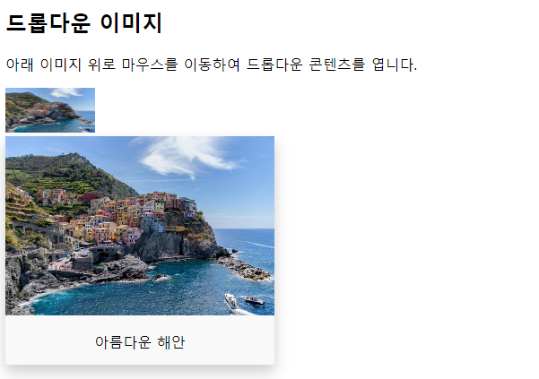 | <!DOCTYPE html> <html> <head> <style> .dropdown { position: relative; display: inline-block; } .dropdown-content { display: none; position: absolute; background-color: #f9f9f9; min-width: 160px; box-shadow: 0px 8px 16px 0px rgba(0,0,0,0.2); z-index: 1; } .dropdown:hover .dropdown-content { display: block; } .desc { padding: 15px; text-align: center; } </style> </head> <body> <h2>드롭다운 이미지</h2> <p>아래 이미지 위로 마우스를 이동하여 드롭다운 콘텐츠를 엽니다.</p> <div class="dropdown"> <img src="img_5terre.jpg" alt="Cinque Terre" width="100" height="50"> <div class="dropdown-content"> <img src="img_5terre.jpg" alt="Cinque Terre" width="300" height="200"> <div class="desc">아름다운 해안</div> </div> </div> </body> </html> |