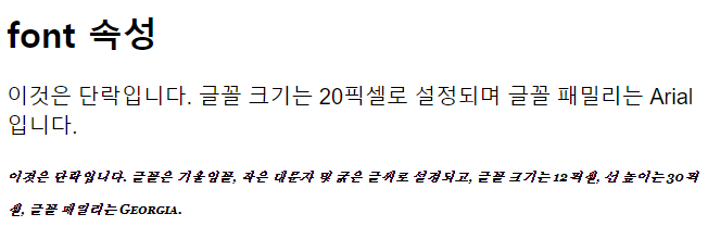 | <!DOCTYPE html> <html> <head> <style> p.a { font: 20px Arial, sans-serif; } p.b { font: italic small-caps bold 12px/30px Georgia, serif; } </style> </head> <body> <h1>font 속성</h1> <p class="a">이것은 단락입니다. 글꼴 크기는 20픽셀로 설정되며 글꼴 패밀리는 Arial입니다.</p> <p class="b">이것은 단락입니다. 글꼴은 기울임꼴, 작은 대문자 및 굵은 글씨로 설정되고, 글꼴 크기는 12픽셀, 선 높이는 30픽셀, 글꼴 패밀리는 Georgia.</p> </body> </html> |