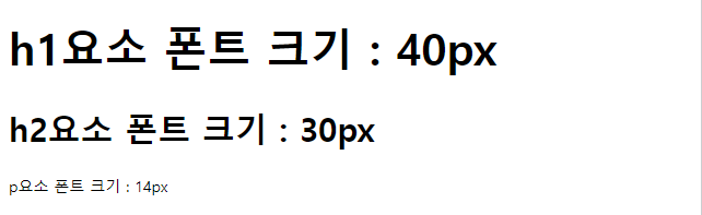 h1요소에 텍스트 크기는 40px, h2요소에 텍스트 크기는 30px, p요소에 텍스트 크기는 14px로 설정하였고, 결과 화면은 아래 그림과 같다.