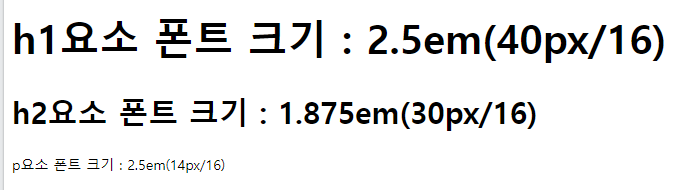 | <!DOCTYPE html> <html> <head> <style> h1 { font-size: 2.5em; /* 40px/16=2.5em */ } h2 { font-size: 1.875em; /* 30px/16=1.875em */ } p { font-size: 0.875em; /* 14px/16=0.875em */ } </style> </head> <body> <h1>h1요소 폰트 크기 : 2.5em(40px/16)</h1> <h2>h2요소 폰트 크기 : 1.875em(30px/16)</h2> <p>p요소 폰트 크기 : 2.5em(14px/16)</p> </body> </html> |