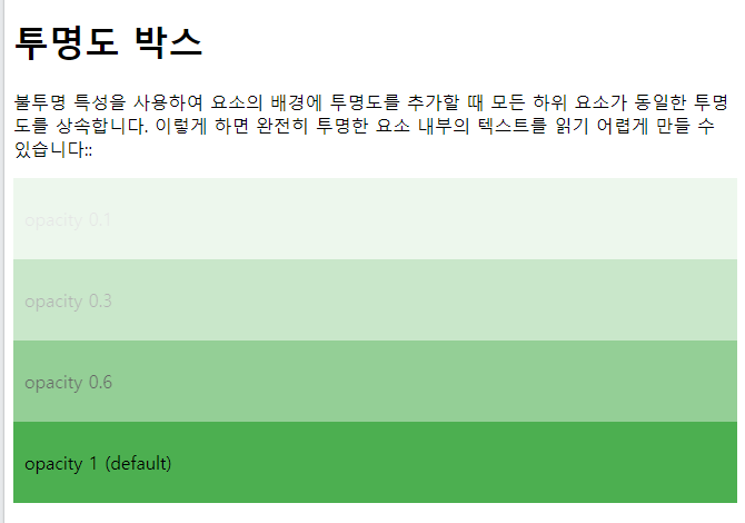 | <!DOCTYPE html> <html> <head> <style> div { background-color: #4CAF50; padding: 10px; } div.first { opacity: 0.1; } div.second { opacity: 0.3; } div.third { opacity: 0.6; } </style> </head> <body> <h1>투명도 박스</h1> <p>불투명 특성을 사용하여 요소의 배경에 투명도를 추가할 때 모든 하위 요소가 동일한 투명도를 상속합니다. 이렇게 하면 완전히 투명한 요소 내부의 텍스트를 읽기 어렵게 만들 수 있습니다::</p> <div class="first"><p>opacity 0.1</p></div> <div class="second"><p>opacity 0.3</p></div> <div class="third"><p>opacity 0.6</p></div> <div><p>opacity 1 (default)</p></div> </body> </html> |