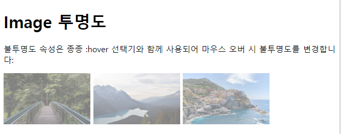 | <!DOCTYPE html> <html> <head> <style> img { opacity: 0.5; } img:hover { opacity: 1.0; } </style> </head> <body> <h1>Image 투명도</h1> <p>불투명도 속성은 종종 :hover 선택기와 함께 사용되어 마우스 오버 시 불투명도를 변경합니다:</p> <img src="img_forest.jpg" alt="Forest" width="170" height="100"> <img src="img_mountains.jpg" alt="Mountains" width="170" height="100"> <img src="img_5terre.jpg" alt="Italy" width="170" height="100"> </body> </html> |