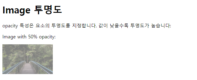 img 요소에 opacity속성에 0.5값을 설정하도록 설정하였고, 실행결과 화면은 아래 그림과 같다.