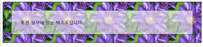 | <!DOCTYPE html> <html> <head> <style> div.background { background: url(klematis.jpg) repeat; border: 2px solid black; } div.transbox { margin: 30px; background-color: #ffffff; border: 1px solid black; opacity: 0.6; } div.transbox p { margin: 5%; font-weight: bold; color: #000000; } </style> </head> <body> <div class="background"> <div class="transbox"> <p>투명 상자에 있는 텍스트입니다.</p> </div> </div> </body> </html> |