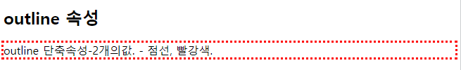 | <!DOCTYPE html> <html> <head> <style> p.ex2 {outline: dotted red;} </style> </head> <body> <h2>outline 속성</h2> <p class="ex2">outline 단축속성-2개의값. - 점선, 빨강색.</p> </body> </html> |