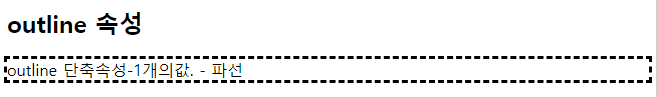 | <!DOCTYPE html> <html> <head> <style> p.ex1 {outline: dashed;} </style> </head> <body> <h2>outline 속성</h2> <p class="ex1">outline 단축속성-1개의값. - 파선</p> </body> </html> |