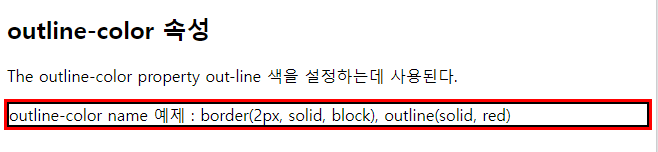 <!DOCTYPE html> <html> <head> <style> p.ex1 { border: 2px solid black; outline-style: solid; outline-color: red; } </style> </head> <body> <h2>outline-color 속성</h2> <p>The outline-color property out-line 색을 설정하는데 사용된다.</p> <p class="ex1">outline-color name 예제 : border(2px, solid, block), outline(solid, red)</p> </body> </html> |