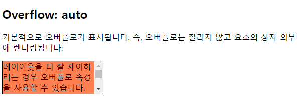 | auto | scroll 과 비슷하지만 필요한 경우에만 스크롤 막대를 추가합니다 |