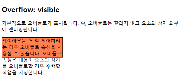 기본적으로 overflow가 visible하게 표시된다. 즉, 오버플로는 잘리지 않고 요소의 상자 외부에 렌더링된다: