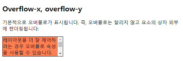 | <!DOCTYPE html> <html> <head> <style> div { background-color: coral; width: 200px; height: 65px; border: 1px solid black; overflow-x: hidden; overflow-y: scroll; } </style> </head> <body> <h2>Overflow-x, overflow-y</h2> <p>기본적으로 오버플로가 표시됩니다. 즉, 오버플로는 잘리지 않고 요소의 상자 외부에 렌더링됩니다:</p> <div>레이아웃을 더 잘 제어하려는 경우 오버플로 속성을 사용할 수 있습니다. 오버플로 속성은 내용이 요소의 상자를 오버플로할 경우 수행할 작업을 지정합니다.</div> </body> </html> |