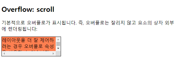 | <!DOCTYPE html> <html> <head> <style> div { background-color: coral; width: 200px; height: 65px; border: 1px solid; overflow: scroll; } </style> </head> <body> <h2>Overflow: scroll</h2> <p>기본적으로 오버플로가 표시됩니다. 즉, 오버플로는 잘리지 않고 요소의 상자 외부에 렌더링됩니다:</p> <div>레이아웃을 더 잘 제어하려는 경우 오버플로 속성을 사용할 수 있습니다. 오버플로 속성은 내용이 요소의 상자를 오버플로할 경우 수행할 작업을 지정합니다.</div> </body> </html> |