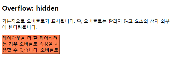 | visible | 기본값. 오버플로가 잘리지 않습니다. 내용이 요소의 상자 밖으로 렌더링됩니다 |