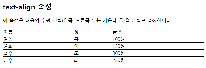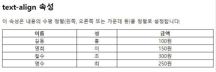 | <!DOCTYPE html> <html> <head> <style> table, td, th { border: 1px solid black; } table { border-collapse: collapse; width: 100%; } th { text-align: left; } </style> </head> <body> <h2>text-align 속성</h2> <p>이 속성은 내용의 수평 정렬(왼쪽, 오른쪽 또는 가운데 등)을 정렬로 설정합니다:</p> <table> <tr> <th>이름</th> <th>성</th> <th>금액</th> </tr> <tr> <td>길동</td> <td>홍</td> <td>100원</td> </tr> <tr> <td>영희</td> <td>이</td> <td>150원</td> </tr> <tr> <td>철수</td> <td>조</td> <td>300원</td> </tr> <tr> <td>명수</td> <td>최</td> <td>250원</td> </tr> </table> </body> </html> |