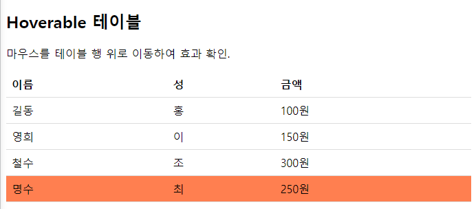 tr요소에 :hover 속성에 background-color: coral색을 설정하여 마우스를 테이블에 움직이면 해당 행은 coral 배경색이 표시되며 아래 그림과 같다.