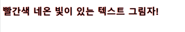 | <!DOCTYPE html> <html> <head> <style> h1 { text-shadow: 0 0 3px #FF0000; } </style> </head> <body> <h1>빨간색 네온 빛이 있는 텍스트 그림자!</h1> </body> </html> |