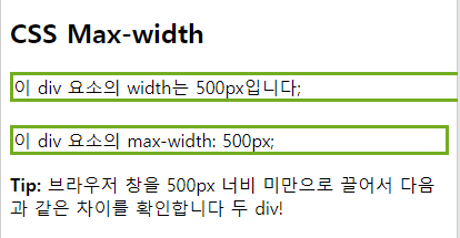<!DOCTYPE html> <html> <head> <style> div.ex1 { width: 500px; margin: auto; border: 3px solid #73AD21; } div.ex2 { max-width: 500px; margin: auto; border: 3px solid #73AD21; } </style> </head> <body> <h2>CSS Max-width</h2> <div class="ex1">이 div 요소의 width는 500px입니다;</div> <br> <div class="ex2">이 div 요소의 max-width: 500px;</div> <p><strong>Tip:</strong> 브라우저 창을 500px 너비 미만으로 끌어서 다음과 같은 차이를 확인합니다 두 div!</p> </body> </html> |