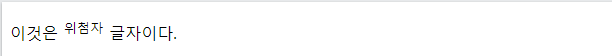 <!DOCTYPE html> <html> <body> <p>이것은 <sup>위첨자</sup> 글자이다.</p> </body> </html> |