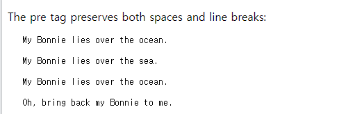<pre> 요소 내부의 텍스트는 고정 너비 글꼴(일반적으로 Courier)로 표시되며 공백과 줄 바꿈을 모두 유지한다: