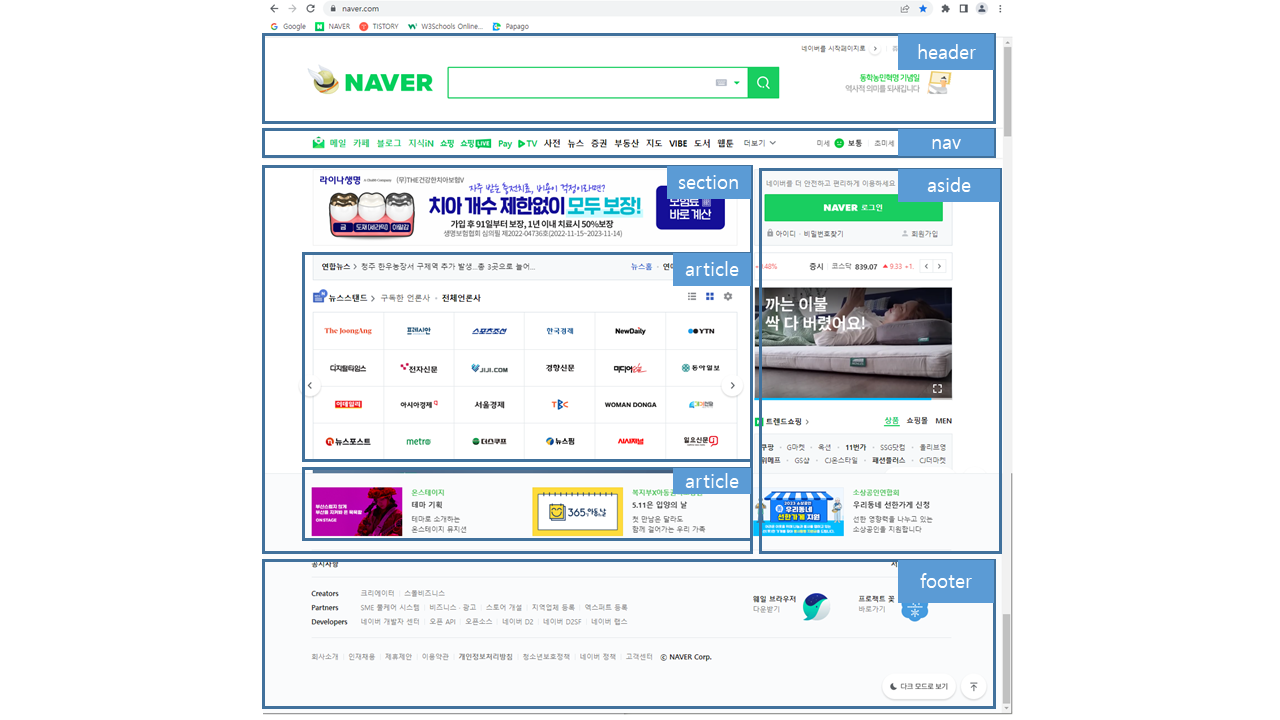 <header> - 문서 또는 섹션의 헤더를 정의한다 <nav> - 내비게이션 링크 세트를 정의한다 <section> - 문서에서 제목(주제)별로 나눌 수 있는 요소를 정의한다 <article> - 독립적이고 자체적인 콘텐츠를 정의한다 <aside> - 사이드바와 같이 내용 외에 내용을 정의한다 <footer> - 문서 또는 섹션의 바닥글을 정의한다 <details> - 사용자가 필요에 따라 열고 닫을 수 있는 추가 세부 정보를 정의한다 <summary> - <details> 요소의 제목을 정의한다 |