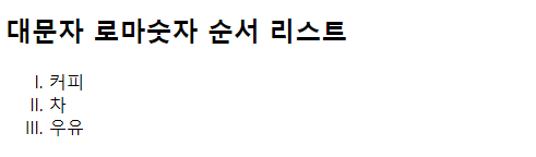 | <!DOCTYPE html> <html> <body> <h2>대문자 로마숫자 순서 리스트</h2> <ol type="I"> <li>커피</li> <li>차</li> <li>우유</li> </ol> </body> </html> |