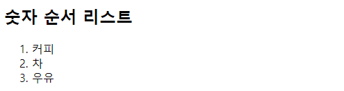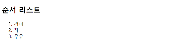 | <!DOCTYPE html> <html> <body> <h2>순서 리스트</h2> <ol> <li>커피</li> <li>차</li> <li>우유</li> </ol> </body> </html> |