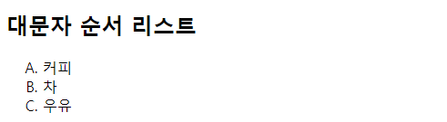 | <!DOCTYPE html> <html> <body> <h2>대문자 순서 리스트</h2> <ol type="A"> <li>커피</li> <li>차</li> <li>우유</li> </ol> </body> </html> |