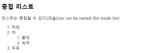 | <!DOCTYPE html> <html> <body> <h2>중첩 리스트</h2> <p>리스트는 중첩될 수 있다.(리슽Lists can be nested (list inside list):</p> <ol> <li>커피</li> <li>차 <ol> <li>홍차</li> <li>녹차</li> </ol> </li> <li>우유</li> </ol> </body> </html> |