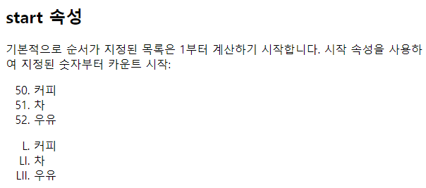 | <!DOCTYPE html> <html> <body> <h2>start 속성</h2> <p>기본적으로 순서가 지정된 목록은 1부터 계산하기 시작합니다. 시작 속성을 사용하여 지정된 숫자부터 카운트 시작:</p> <ol start="50"> <li>커피</li> <li>차</li> <li>우유</li> </ol> <ol type="I" start="50"> <li>커피</li> <li>차</li> <li>우유</li> </ol> </body> </html> |
