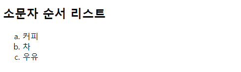 | <!DOCTYPE html> <html> <body> <h2>소문자 순서 리스트</h2> <ol type="a"> <li>커피</li> <li>차</li> <li>우유</li> </ol> </body> </html> |