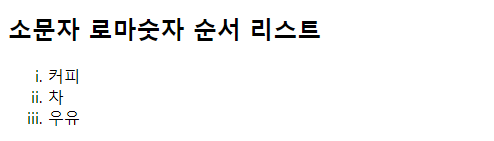 | <!DOCTYPE html> <html> <body> <h2>소문자 로마숫자 순서 리스트</h2> <ol type="i"> <li>커피</li> <li>차</li> <li>우유</li> </ol> </body> </html> |