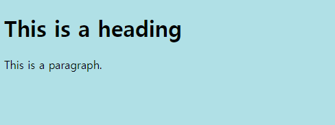 | <body style="background-color:powderblue;"> <h1>이것은 제목이다.</h1> <p>이것은 단락이다.</p> </body> |
