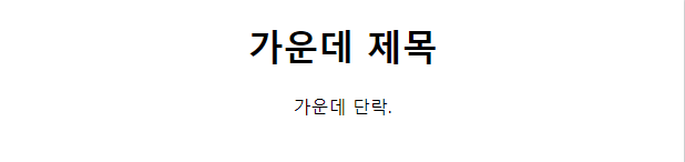 | <!DOCTYPE html> <html> <body> <h1 style="text-align:center;">가운데 제목</h1> <p style="text-align:center;">가운데 단락.</p> </body> </html> |