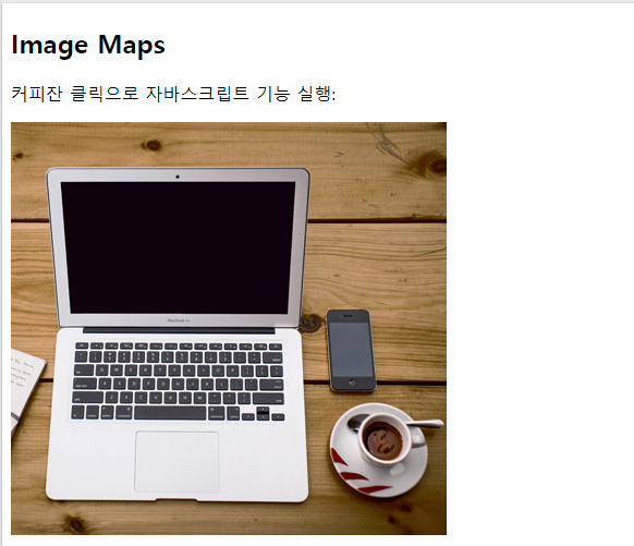 | <!DOCTYPE html> <html> <body> <h2>이미지 맵</h2> <p>새 페이지로 이동하여 항목에 대한 자세한 내용을 보려면 컴퓨터, 전화 또는 커피 잔을 클릭하십시오:</p> <img src="workplace.jpg" alt="Workplace" usemap="#workmap" width="400" height="379"> <map name="workmap"> <area shape="rect" coords="34,44,270,350" alt="Computer" href="computer.htm"> <area shape="rect" coords="290,172,333,250" alt="Phone" href="phone.htm"> <area shape="circle" coords="337,300,44" alt="Cup of coffee" href="coffee.htm"> </map> </body> </html> |