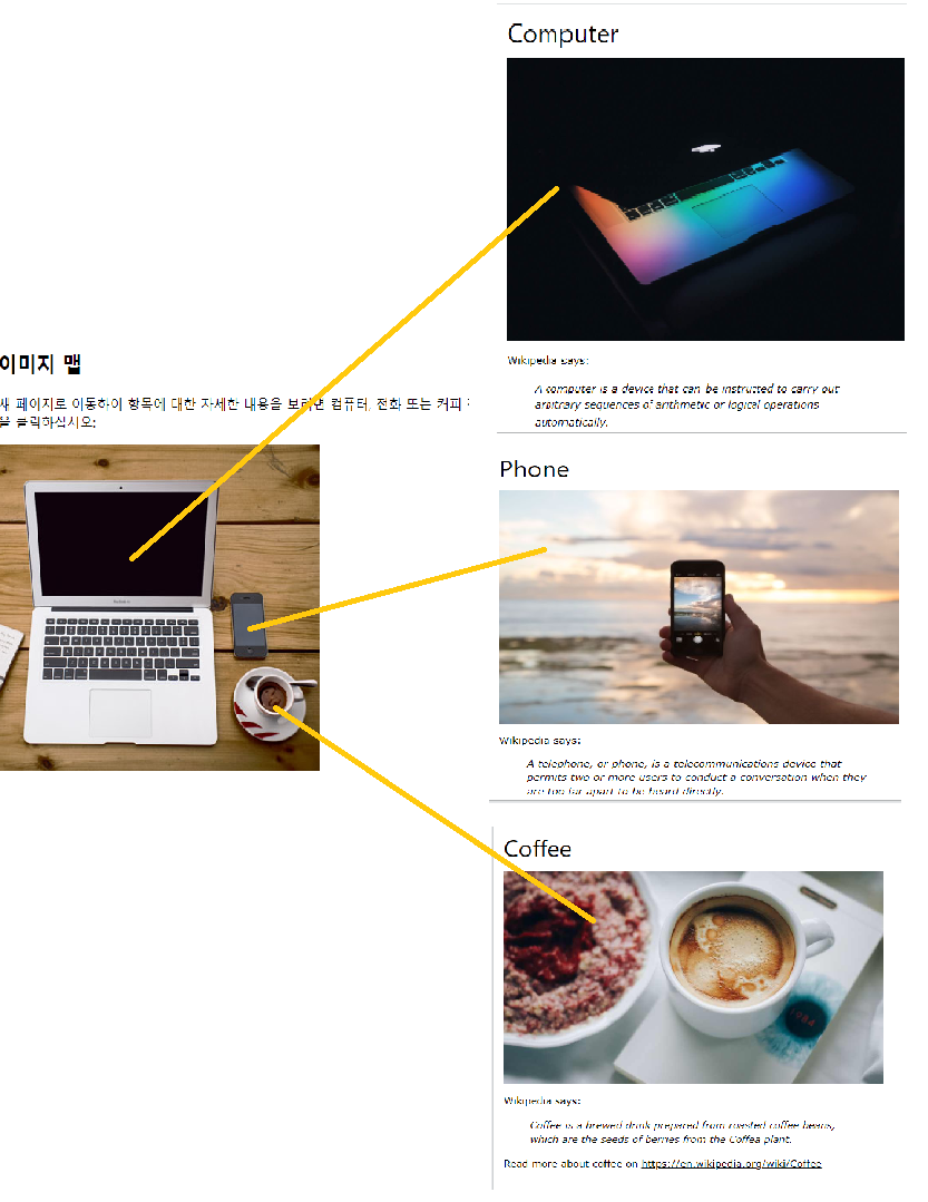 이미지 맵을 만들려면 이미지와 클릭 가능한 영역을 설명하는 HTML 코드가 필요하다.