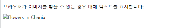 | <!DOCTYPE html> <html> <body> <p>브라우저가 이미지를 찾을 수 없는 경우 대체 텍스트를 표시합니다:</p> <img src="wrongname.gif" alt="Flowers in Chania"> </body> </html> |