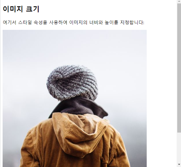 | <!DOCTYPE html> <html> <body> <h2>이미지 크기</h2> <p>여기서 스타일 속성을 사용하여 이미지의 너비와 높이를 지정합니다:</p> <img src="img_girl.jpg" alt="Girl in a jacket" style="width:500px;height:600px;"> </body> </html> |
