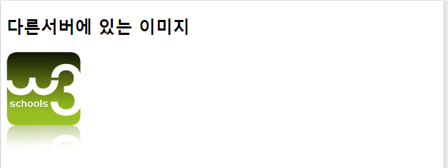 | <!DOCTYPE html> <html> <body> <h2>다른서버에 있는 이미지</h2> <img src="https://www.w3schools.com/images/w3schools_green.jpg" alt="W3Schools.com" style="width:104px;height:142px;"> </body> </html> |