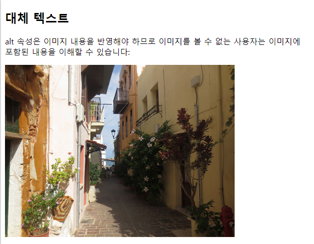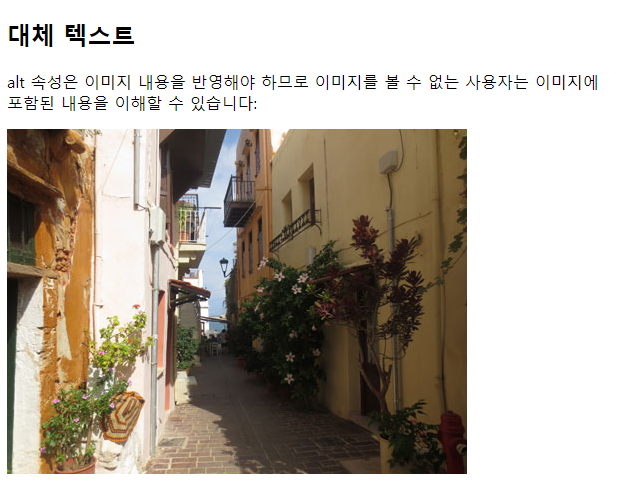| <!DOCTYPE html> <html> <body> <h2>대체 텍스트</h2> <p>alt 속성은 이미지 내용을 반영해야 하므로 이미지를 볼 수 없는 사용자는 이미지에 포함된 내용을 이해할 수 있습니다:</p> <img src="img_chania.jpg" alt="Flowers in Chania" width="460" height="345"> </body> </html> |