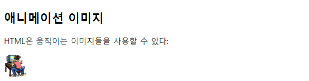 | <!DOCTYPE html> <html> <body> <h2>애니메이션 이미지</h2> <p>HTML은 움직이는 이미지들을 사용할 수 있다:</p> <img src="programming.gif" alt="Computer man" style="width:48px;height:48px;"> </body> </html> |