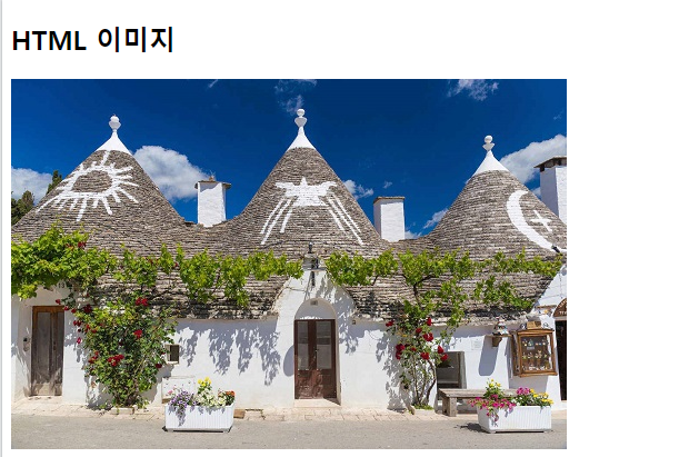 | <!DOCTYPE html> <html> <body> <h2>HTML 이미지</h2> <img src="pic_trulli.jpg" alt="Trulli" width="500" height="333"> </body> </html> |