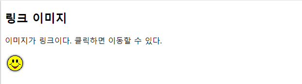 | <!DOCTYPE html> <html> <body> <h2>링크 이미지</h2> <p>이미지가 링크이다. 클릭하면 이동할 수 있다.</p> <a href="default.asp"> <img src="smiley.gif" alt="HTML tutorial" style="width:42px;height:42px;"> </a> </body> </html> |