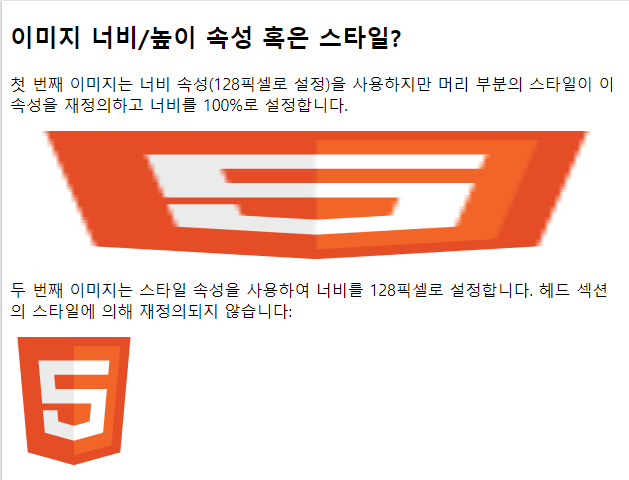 | <!DOCTYPE html> <html> <head> <style> /* This style sets the width of all images to 100%: */ img { width: 100%; } </style> </head> <body> <h2>이미지 너비/높이 속성 혹은 스타일?</h2> <p>첫 번째 이미지는 너비 속성(128픽셀로 설정)을 사용하지만 머리 부분의 스타일이 이 속성을 재정의하고 너비를 100%로 설정합니다.</p> <img src="html5.gif" alt="HTML5 Icon" width="128" height="128"> <p>두 번째 이미지는 스타일 속성을 사용하여 너비를 128픽셀로 설정합니다. 헤드 섹션의 스타일에 의해 재정의되지 않습니다:</p> <img src="html5.gif" alt="HTML5 Icon" style="width:128px;height:128px;"> </body> </html> |