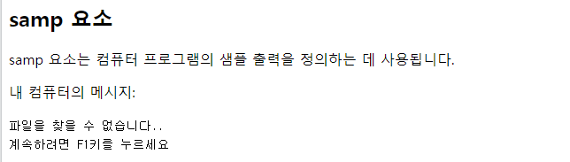 <samp> 요소는 컴퓨터 프로그램의 샘플 출력을 정의한다.