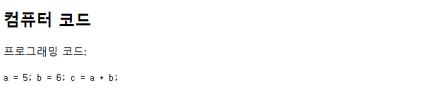 | <!DOCTYPE html> <html> <body> <h2>컴퓨터 코드</h2> <p>프로그래밍 코드:</p> <code> a = 5; b = 6; c = a + b; </code> </body> </html> |